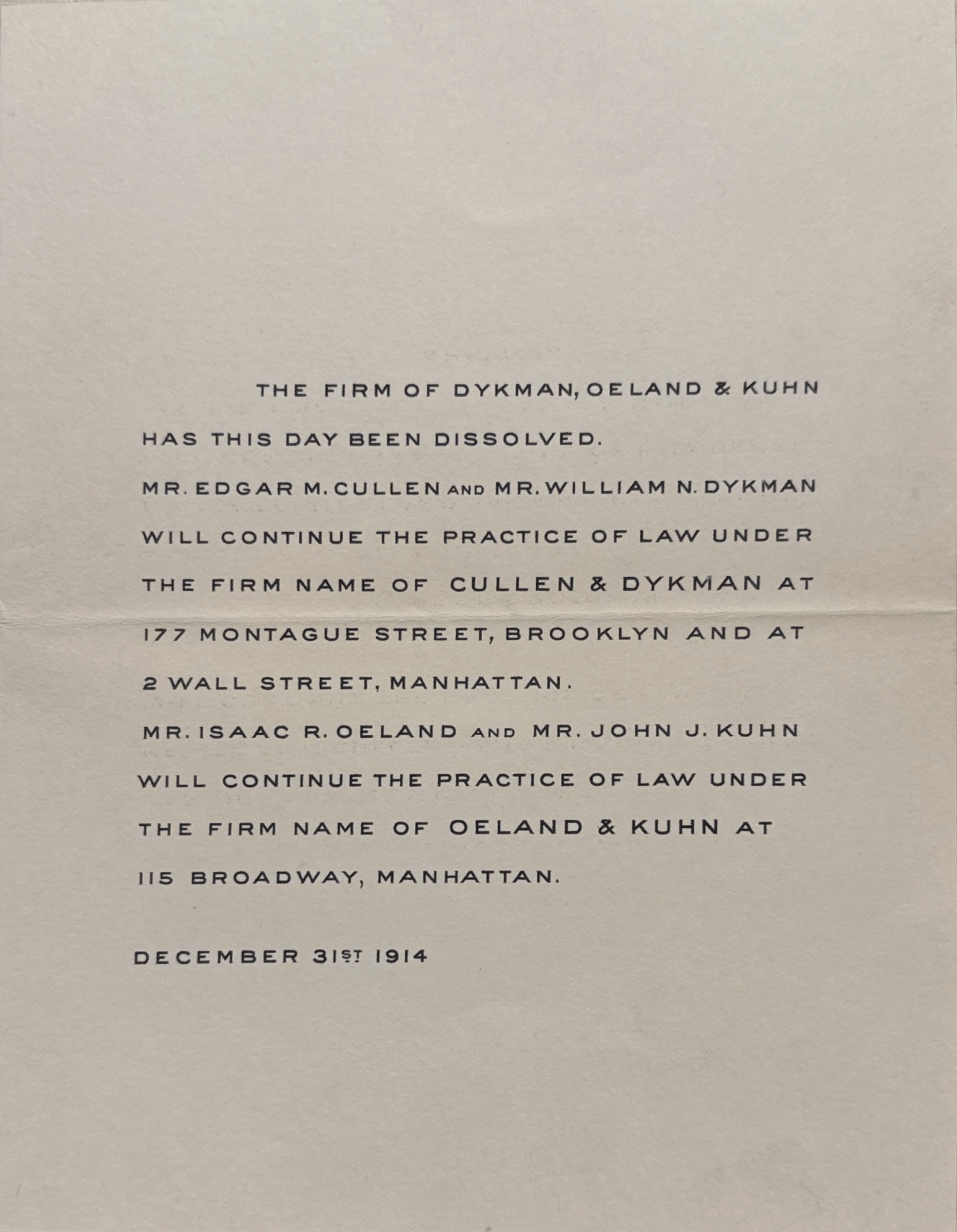 Alexander McCue, our founding partner, who later became a Judge, started practicing law in 1850 in the City of Brooklyn. Twenty years later, he joined two other distinguished Brooklyn lawyers to form the firm of McCue, Hall and Cullen. One of those partners, the Honorable Edgar M. Cullen, progressed through the New York judiciary to become the Chief Judge of the State.